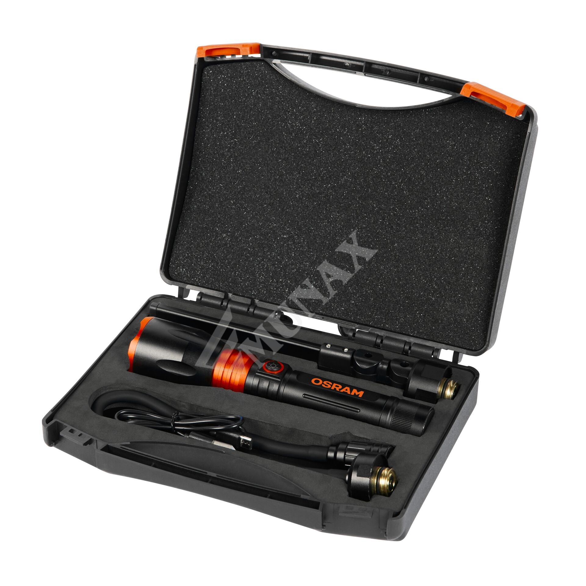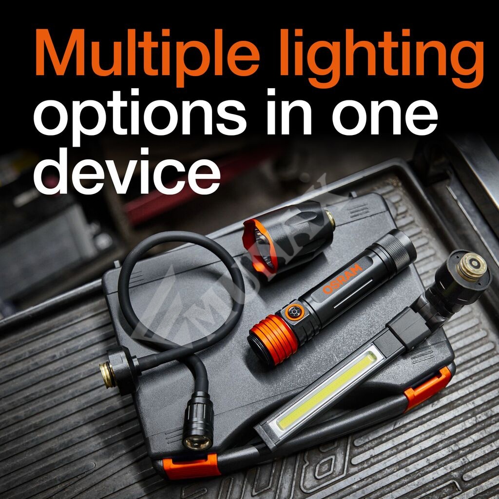Set multifuncțional cu 3 module interschimbabile: lanternă (500 lm), lampă de lucru (450 lm) și lampă cu gât flexibil (160 lm) – ideal pentru ateliere auto, service-uri și lucrări de montaj.